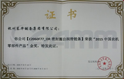 會上,與會人員主要圍繞會議主題進行技術、市場、創新、發展等廣泛交流。會議期間,評比并頒發了2015中國農機零部件46項金獎產品和25項創新獎產品。東華申報的C2060F77_OR和C2062H_ORSDF1密封圈鏈條經久保田、福田雷沃等知名整機企業的推薦,專家委員會最終評審決定,對   東華申報的這兩款密封圈鏈條分別授予金獎和創新獎。這個獎項是目前農機鏈條企業的最高榮譽,體現了東華農機鏈條處于國內同行領先水平,得到廣大農業主機單位的贊譽和認可。東華生產的農機鏈條也暢銷國際市場,與CLASS、紐荷蘭等世界500強企業配套。