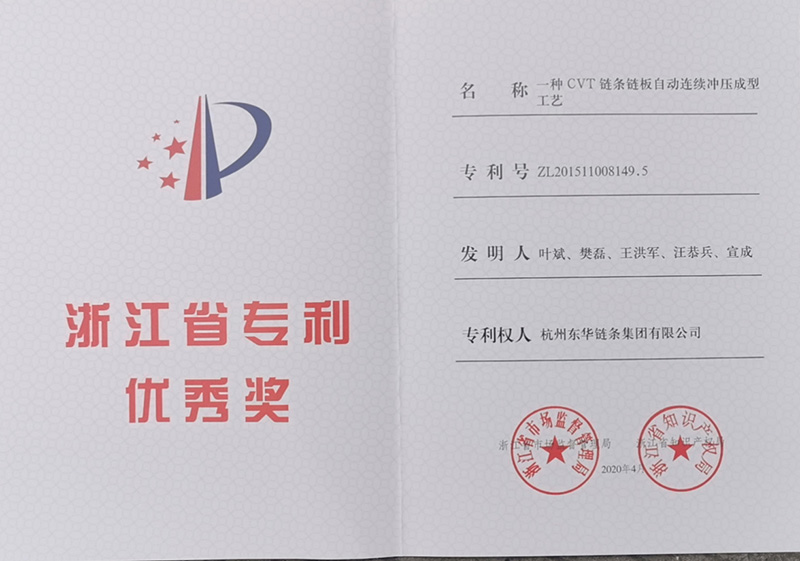 東華鏈條集團“一種CVT鏈條鏈板自動連續(xù)沖壓成型工藝”發(fā)明專利榮獲浙江省專利優(yōu)秀獎。本工藝投入使用后,在不增加人工、設備情況下,提升產品質量,同時可省去傳統(tǒng)去毛刺工序,節(jié)約加工時間,提高效率,縮短產品加工流程,提高產品質量的穩(wěn)定性。