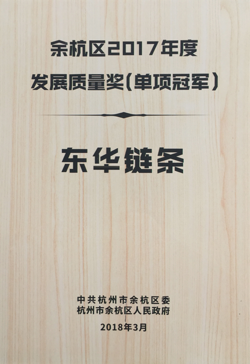 東華鏈條被授予“余杭區(qū)2017年度發(fā)展質(zhì)量獎(jiǎng)(單項(xiàng)冠軍)”稱號(hào)