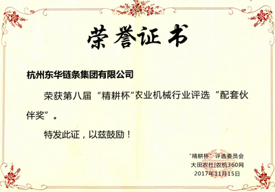 峰會后舉行了第八屆“精耕杯”頒獎典禮活動,共設置評委會“綠色獎”、“創新獎”、“設計獎”、“中國市場影響力品牌”、“配套伙伴獎”五大類共35個獲獎席位,推舉出了我國農機行業的年度榜樣和年度力量。東華集團榮獲“配套伙伴獎”。