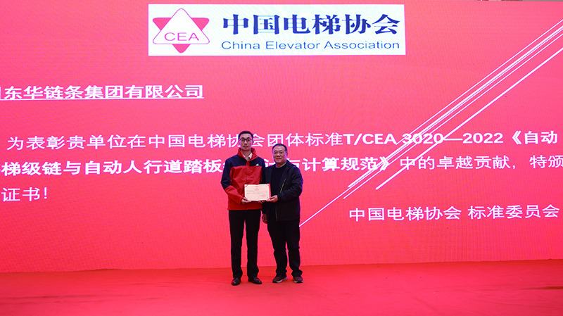 近日,中國電梯協會標準委員會授予東華鏈條集團榮譽證書,以表彰東華在中國電梯團體標準T/CEA 3020-2022《自動扶梯梯級鏈與自動人行道踏板鏈設計與計算規范》中的卓越貢獻。東華扶梯工程鏈事業部代表公司出席了頒獎儀式。