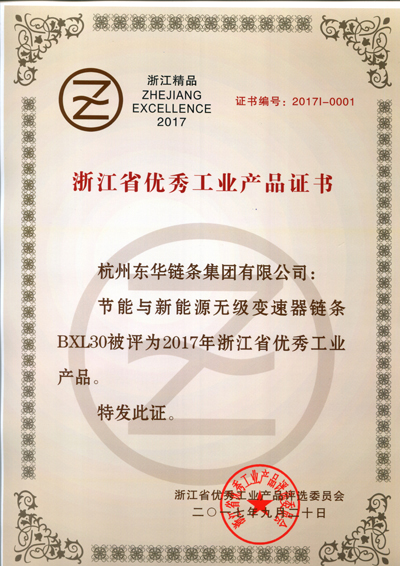 東華鏈條集團“BXL30節能與新能源無級變速器鏈條”被授予“2017年浙江省優秀工業產品”稱號